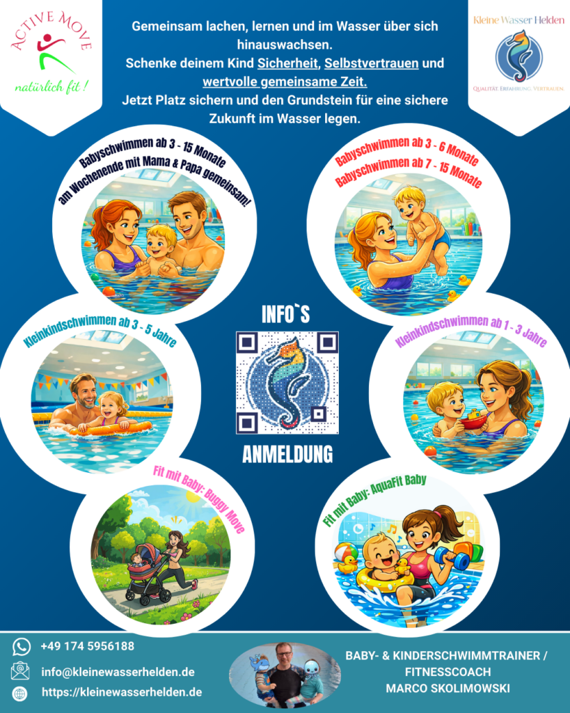 Unsere speziell entwickelten Kurse für Babys, Kleinkinder und Kindern bis ins Vorschulalter, bieten wir eine sichere und liebevolle Umgebung, in der die Kleinsten spielerisch die Freude am Wasser entdecken. Durch gezielte Übungen und bewährte Techniken fördern wir die natürliche Bewegungsfreude und das Vertrauen der Kinder ins Element Wasser und bereiten die Kinder auf das Seepferdchen vor.